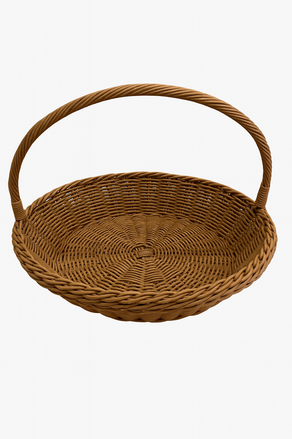 Cesta Fruteira Redonda com Alça – V0: fruteira em vime sintético com estrutura reforçada e alça arqueada, ideal para frutas, pães e composições decorativas.