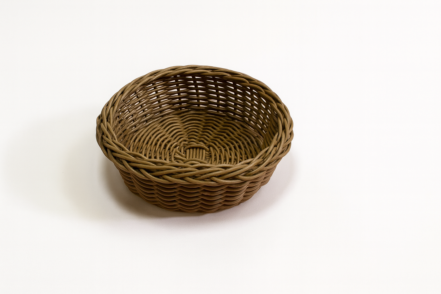 Cesta padeira redonda com fundo em vime sintético, ideal para exposição de pães, frutas e itens de padaria.